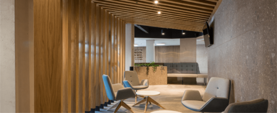 The interior design should incorporate natural elements / finishes and planting into the space. Utilising Biophilic design principles has proven benefits for mental health & wellbeing. Seating should be adjustable, acoustic screens & design elements that absorb noise. The chairs and soft seating should be comfortable to enable recuperative down-time. Layout / space planning should make the best use of natural light. Open plan areas lit by smart LED ‘daylight’ panel lighting which adjusts their intensity throughout the day. Finally well-designed breakout & kitchen areas, an absolute must to maintain a happy workforce!
