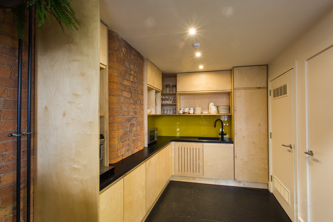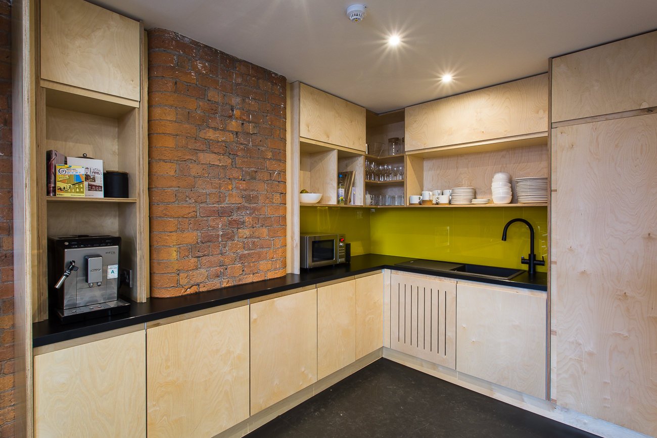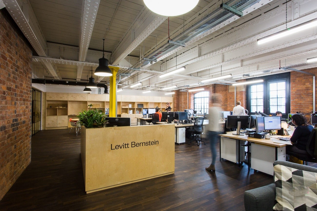 “We transformed a raw shell in Manchester’s Bonded Warehouse into a bespoke, collaborative workspace for Levitt Bernstein Architects, featuring custom joinery, crittall-style partitions, and a fully fitted kitchen—all within an 8-week programme.”