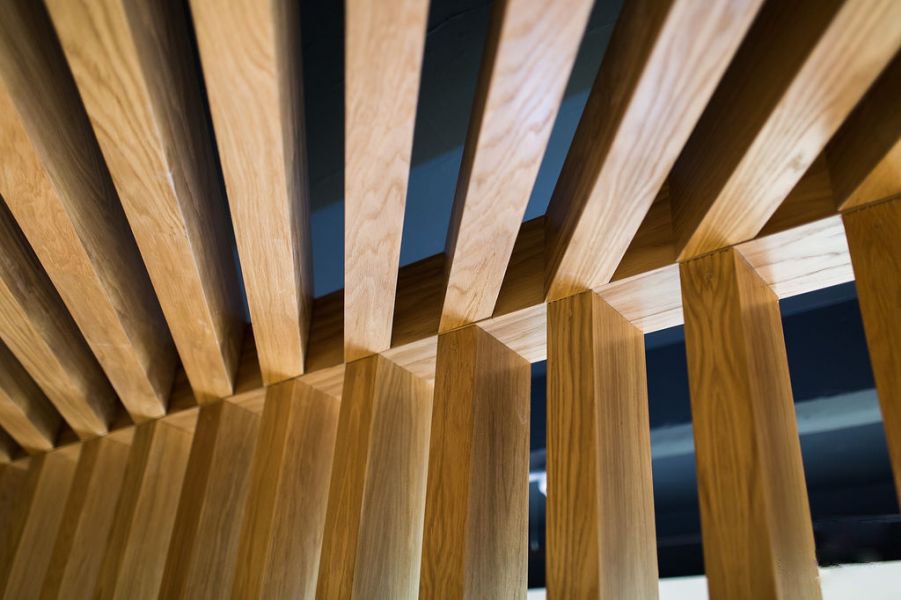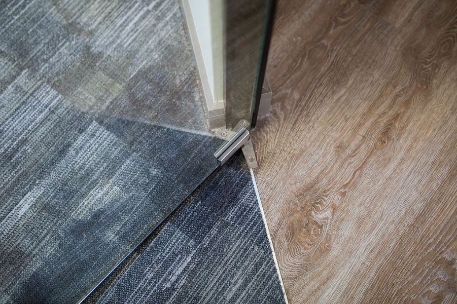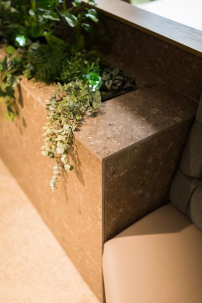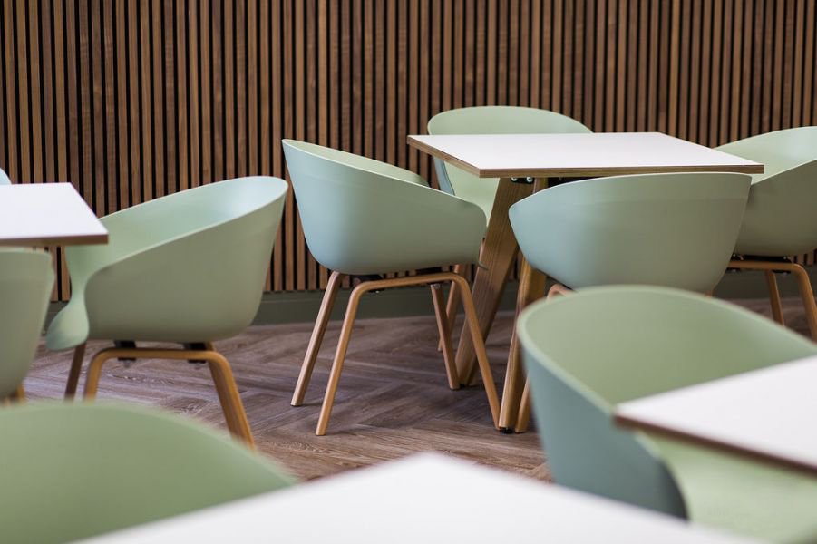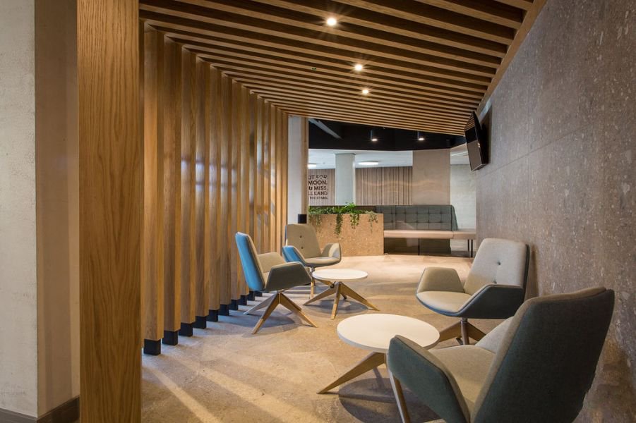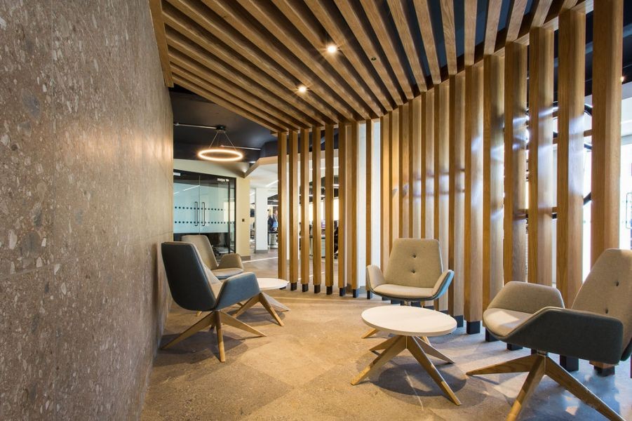 The design used a pastel palette, which incorporated a core 9 soft tone colours on the walls and in the fabrics used on the bespoke seating. The floor finishes reflected the ‘resimercial’ theme using large format acoustic warm concrete and oversized Wharfside Ash in the breakout/café. Carpet tiles from Tarkett in 3 colours blended into each other across the floorplate. Junction strips were formed into radii to soften the geometry. Finishing touches included natural waxed oak cladding, bespoke signage and plenty of planting. and formal meeting space with Crittall glazing and slim-line sliding screens.