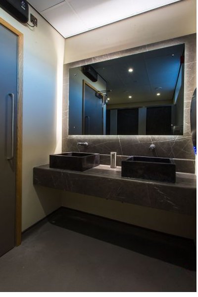 The scope of works included full design drawings, submission to building control, mechanical, air conditioning, electrical, acoustic partitions, acoustic glass and aluminium screens, bespoke concertina opening doors, kitchens, joinery, data, lighting, desks, furniture, and storage.